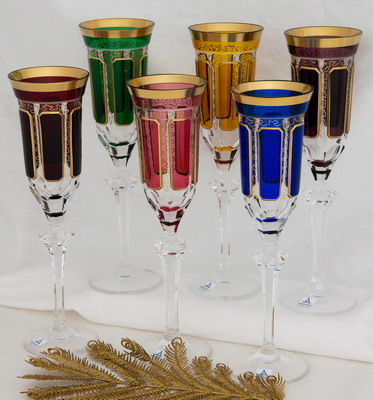 Очень оригинальный и неповторимый набор бокалов под шампанское. Имеет неповторимый эксклюзивный дизайн. Бокалы выполнены на тонких прозрачных ножках из хрусталя. Сложное украшение самого бокала разнообразными рисунками и линиями из золота придает этому набору дополнительный шик. Он создан для настоящих ценителей красоты, качества и оригинальности.