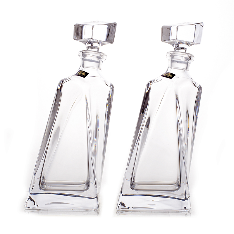 Штоф "Ловерс" – это набор из двух единиц изделий. Каждое из этих изделий имеет красивую и оригинальную форму, позволяющую использовать его как в повседневном бытовом обиходе, так и во время проведения различных торжественных событий и праздников. Красивое основание штофа имеет форму квадрата. Поднимаясь к верху, изделие сужается по конусу к маленькому квадрату. При этом грани изделия плавно прокручиваются на тридцать градусов.
