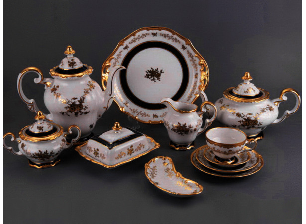 Изысканный чайный сервиз «Анна Амалия 820» украсит каждый кухонный гарнитур. Набор состоит из 55 фарфоровых предметов. Цветовая гамма соединила нежно-белый, классически черный и богатый золотой. Сервиз рассчитан на 12 персон. В комплект входят масленка, молочник, заварник, большой чайник, сахарница, лимонница. Кроме этого есть 12 чашек и по три блюдца разных размеров для каждого. Сервиз выполнен немецкими дизайнерами.