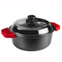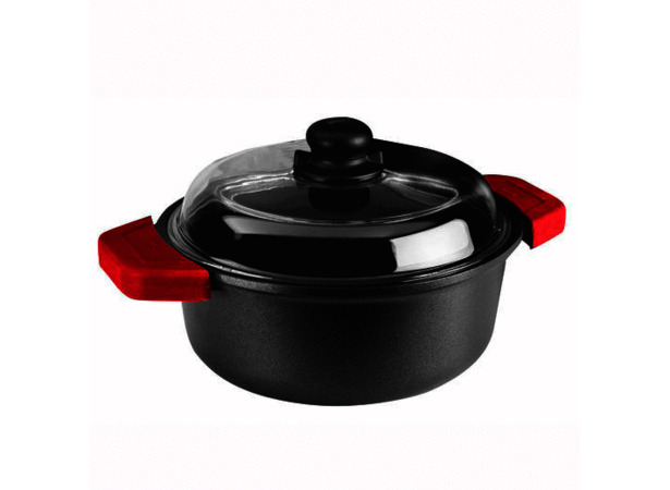Кастрюля из литого антипригарного алюминия с толстым дном, со стеклянной крышкой, ручка из бакелита. Толщина: 6 мм