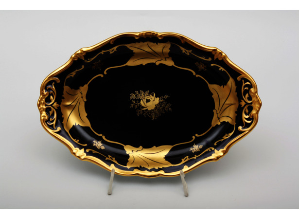 Темная посуда производит самое неожиданное впечатление. Сочетание черного с золотом просто поражает своей роскошью и изысканностью. Это блюдо смотрится действительно богато. Немецкий фарфор высочайшего качества в подобном дизайнерском решении, это несомненный успех у покупателей. Всегда приятно кушать из такой несравненной посуды. Чувствуешь себя на приеме у королевы.