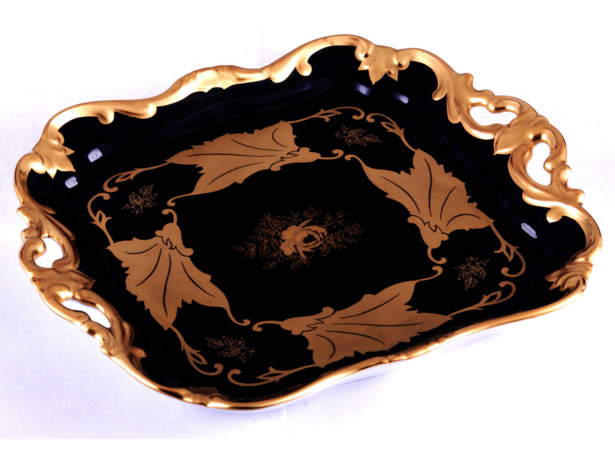Квадратное блюдо без ножки «Кленовый лист» с оригинальным изображением кленовых листьев и красивым узором. Смотрится в меру насыщенным и богатым, этот эффект блюду придает изысканная каемка с вырезами. Темно-синий и золотистый цвета вызывают ассоциацию с чем-то роскошным, как на самом деле и выглядит данное блюдо. Изделие изготовлено из натурального фарфора.