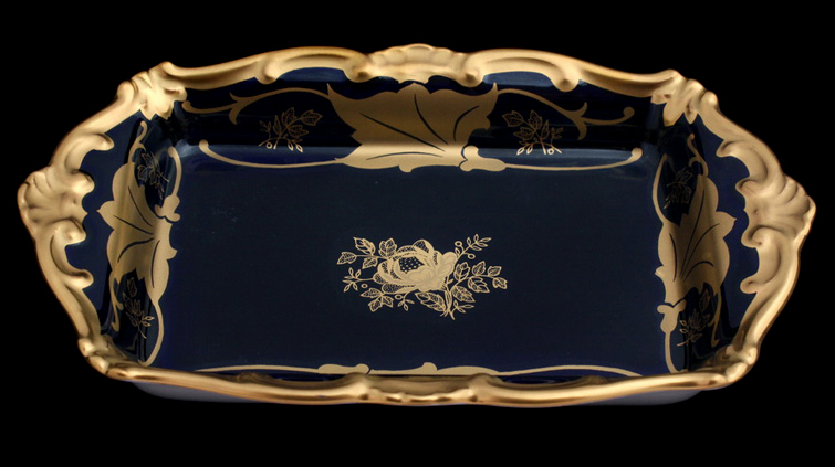 Масленка «Кленовый лист» открытая, без крышки. Изготовлена из фарфора, темного синего цвета. Бока разрисованы золотистыми кленовыми листьями, а посередине небольшая золотистая розочка. Достаточно насыщенное и яркое изделие, которое сразу же привлекает к себе внимание. Богатства масленке добавляет красивая каемка с выгибами и выступами. Изготовлена из высококачественного немецкого фарфора.