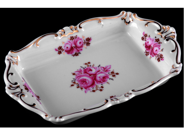 Очень красивое и нежное изделие. На нем нет ничего лишнего – милые розочки нежного розового цвета, аккуратный, но в то же время оригинальный золотистый узор. Сочетание цветов просто великолепно – розовый на белом, делает изделие легким и воздушным. Такая масленка отлично впишется в любой набор для завтрака белого цвета. Изделие выполнено из фарфора немецким производителем Weimar Porzellan.