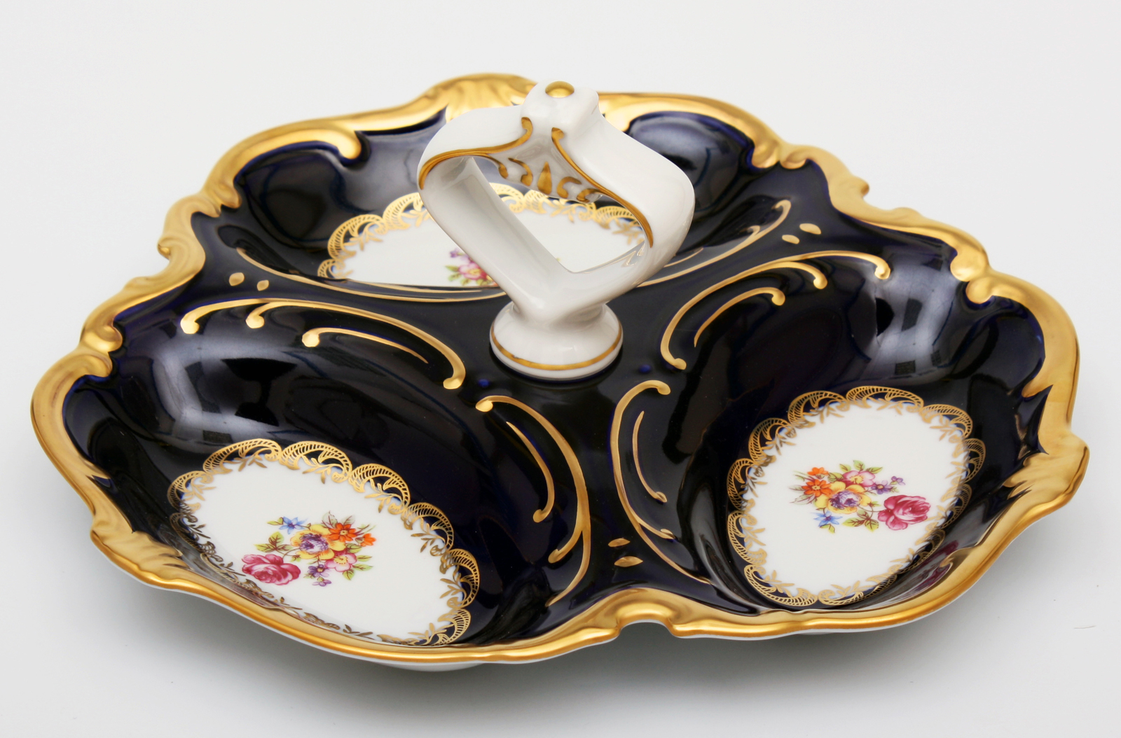 Менажница «С.Петербург» - очень яркое и роскошное изделие из фарфора. Сочетает в себе три цвета – это белый, черный и золотистый, а также мелкие разноцветный цветочки, которые являются изюминкой менажницы. Орнамента на изделии не много, так только подчеркивает контур каждой части. Очень оригинально смотрится днище каждого углубления – белое с окантовочкой, а посредине соцветие разноцветных цветочков.