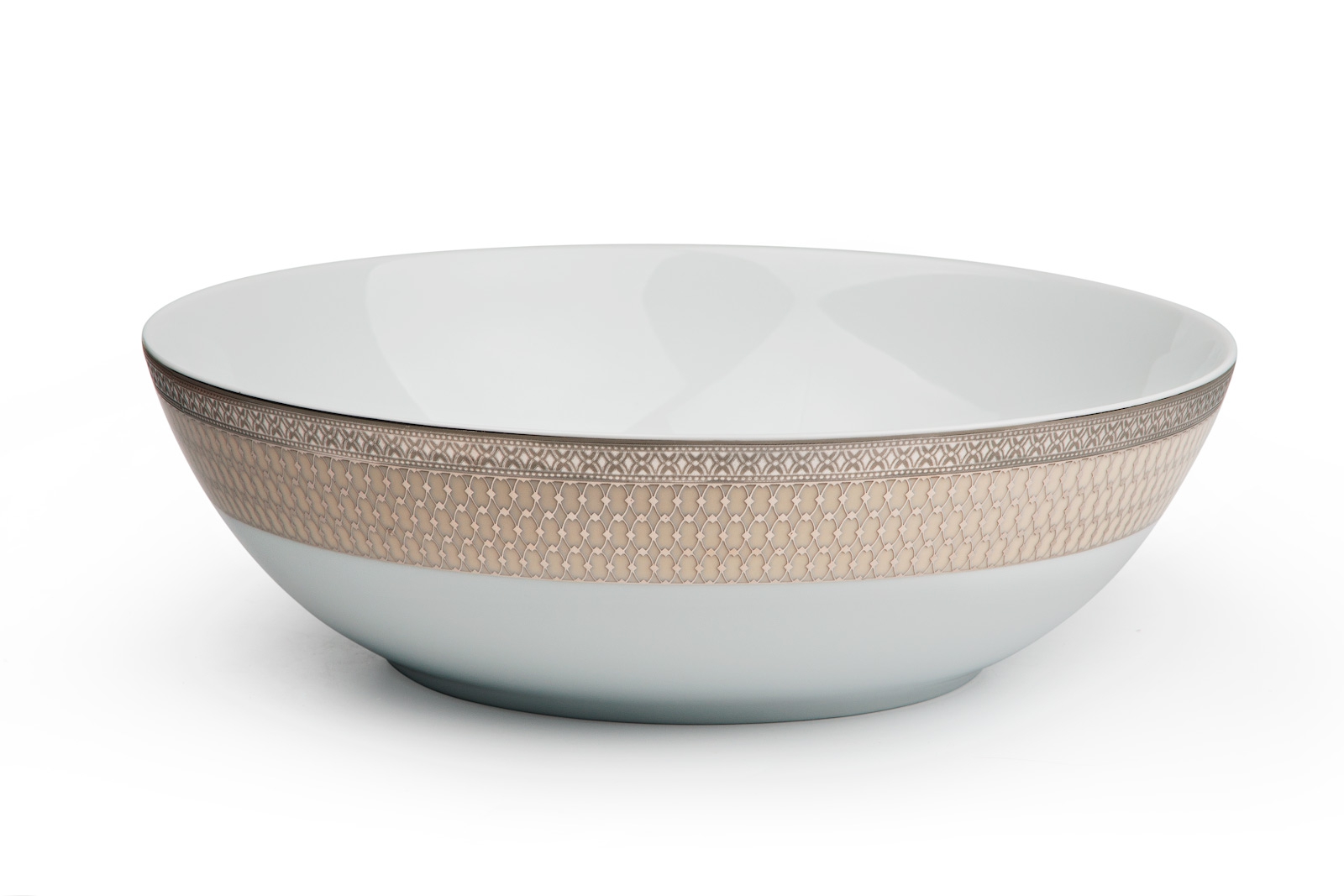 Столовый сервиз Victoire Platine из коллекции Tanit назван именем прекрасной богини луны, почитавшейся в древнем Карфагене. Изящный платиновый узор, напоминающий сетку сладких медовых сот, расположился на кайме цвета топлёного молока. Белизна лиможского фарфора придаёт сервизу аристократичное благородство. Традиционный европейский дизайн и качество предметов сервировки станут украшением званного ужина или тёплого семейного торжества, преобразят интерьер кухни и столовой, создадут атмосферу уюта и лёгкости.