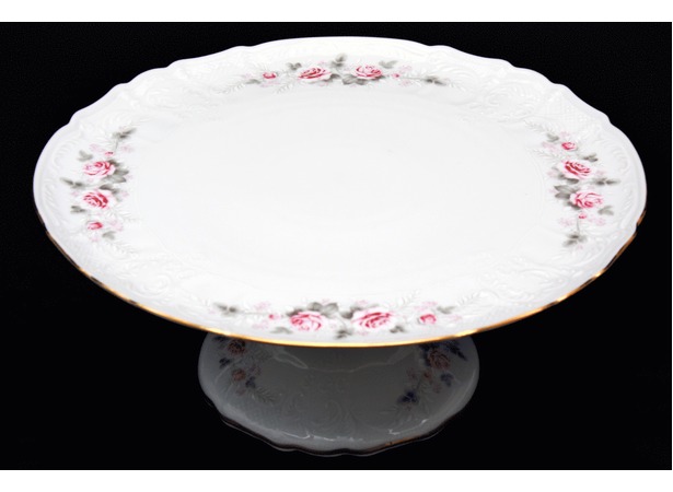 Тортница «Бернадот Серая роза золото» сделана из фарфора. На тортнице можно увидеть красивые изображения цветов – роз. Они находятся по краям тортницы. Кроме того, у тортницы есть ножка, на которой тоже изображены розы. Она станет красивым дополнением вашего праздничного стола и обязательно запомниться своей привлекательностью и оригинальностью вашим гостям.