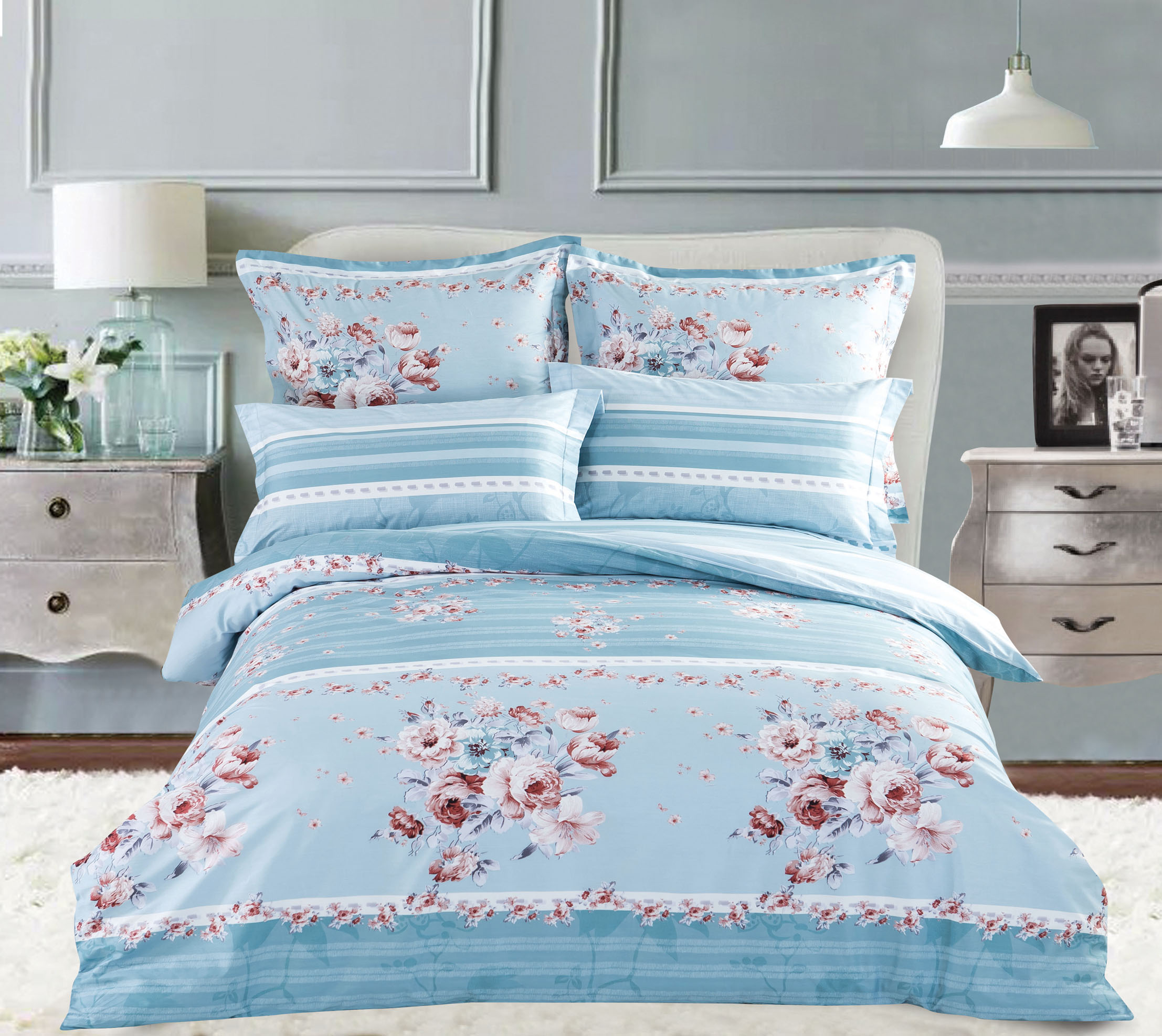 Комплект постельного белья Сайлид "Цветы и полоски на голубом фоне" сатин, 1,5 сп.