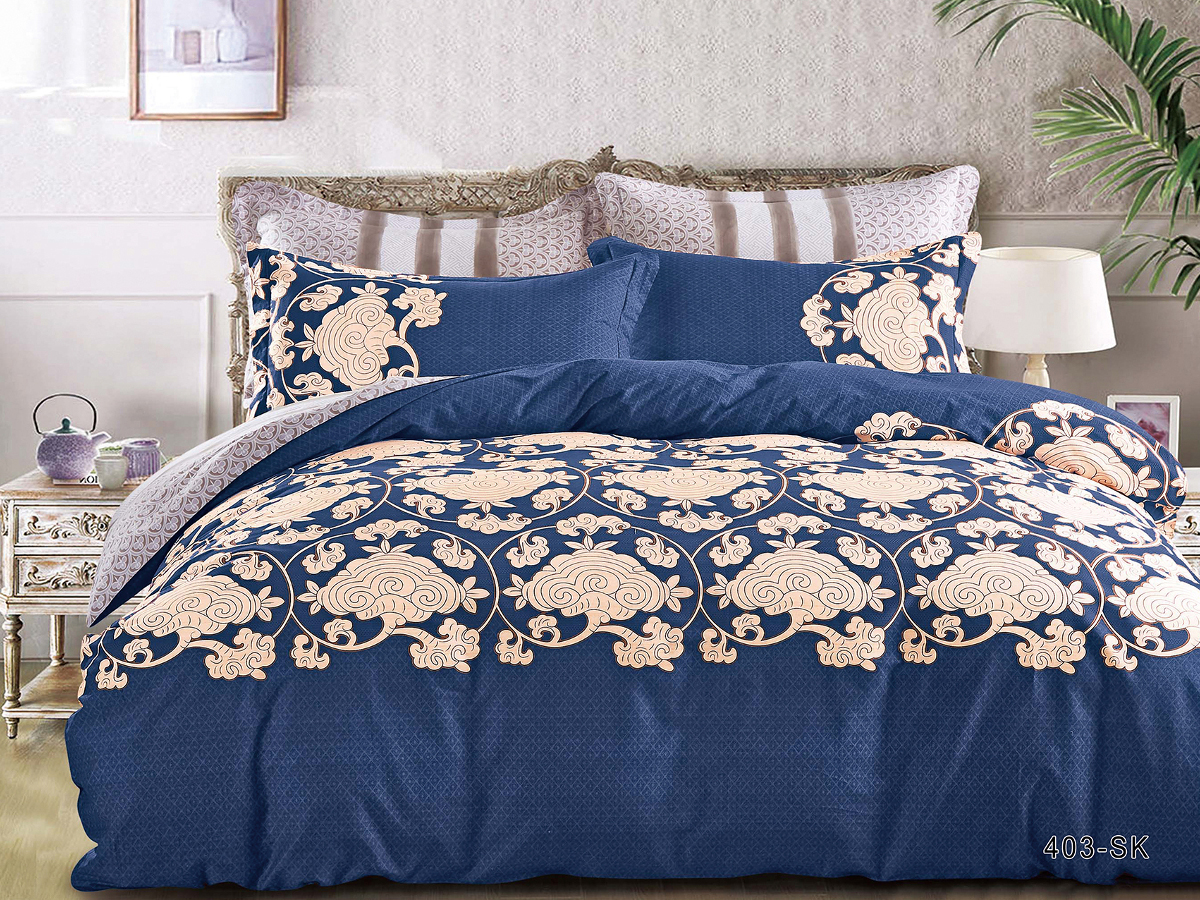 Комплект постельного белья Cleo Кремовые узоры на синем фоне сатин, 1,5 сп.