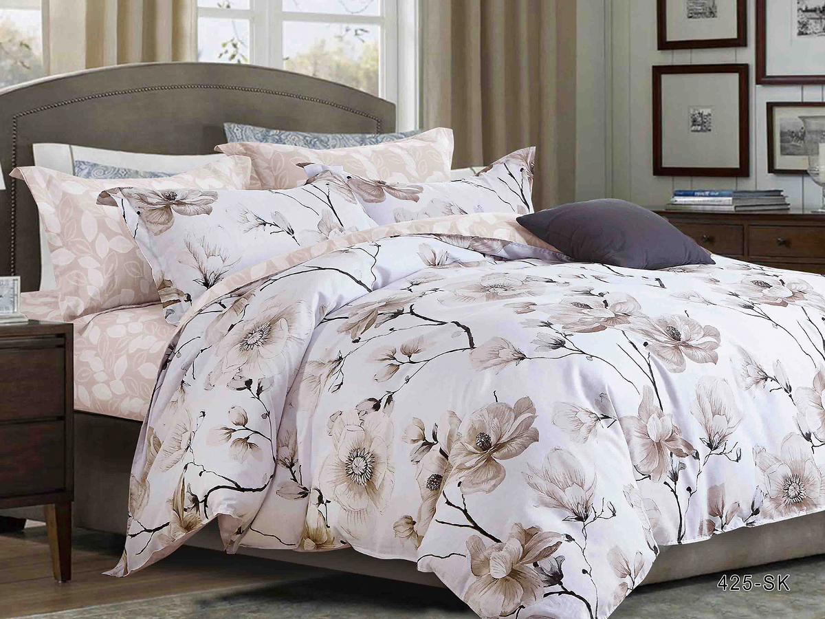 Комплект постельного белья Cleo Бело-бежевый с цветами сатин, 1,5 сп.
