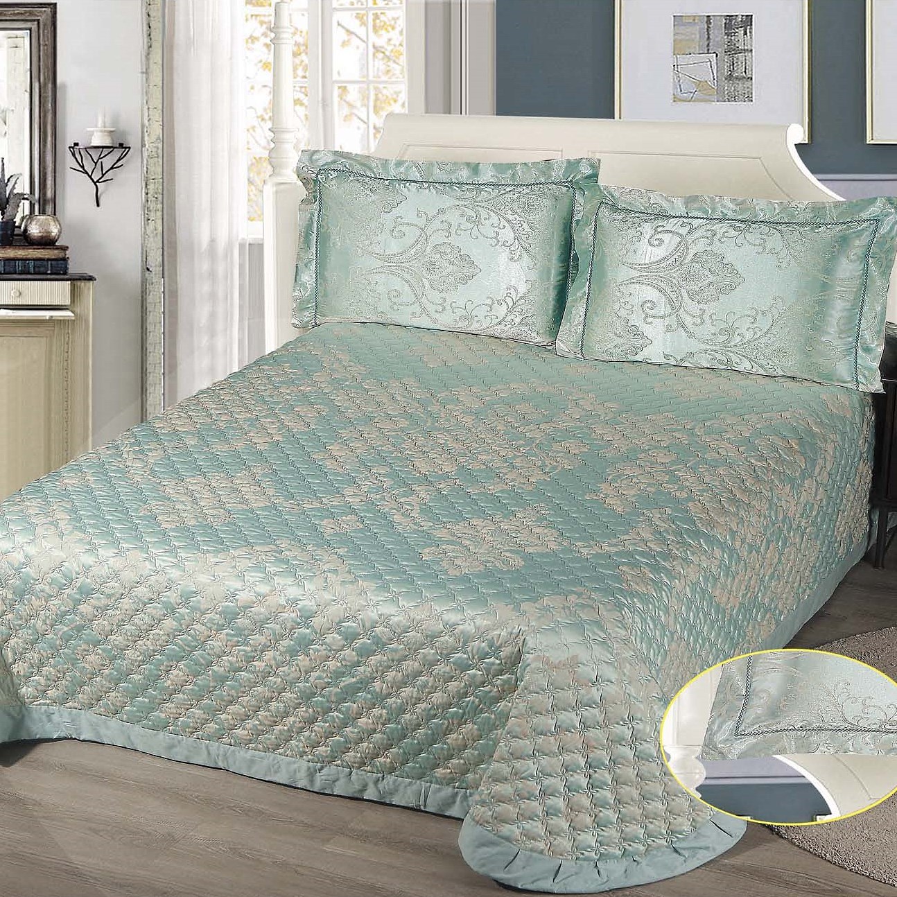 Покрывало простегано по тонкому синтепону. Наволочки с клапаном (запахом): лицевая сторона - жаккард (50% хлопок, 50% вискоза), нижняя сторона - сатин (100 % хлопок).